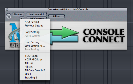 When you reopen your project, the MIOConsoleConnect plugin will automatically launch MIOConsole and update the state of your hardware to match the settings saved in your session. This is all done automatically and transparently to you. Since the MIO can have complex routings, mixer settings, analog level settings and +DSP patches, MIOConsoleConnect extends total recall of your session outside the bounds of your workstation software and out into the physical world.Being able to have total recall of the complete hardware state in your host’s session files is very exciting and powerful, and opens up many new possibilities. For example, this in-session total recall gives you the ability to preconfigure host session templates that automatically prepare your hardware for tracking (setting up the Mic pres and monitor mixes, for example). If this was the extent of the integration, it would be very useful. But MIOConsoleConnect does not stop there.