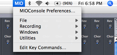 Since MIOConsole loses its menubar when you are running it in Plugin mode, you lose access to a number of commands that are only available from the menubar (for example: MIOConsole Preferences, Recording Preferences, etc.). In order to provide you with access to these critical commands, we have added a MIO “Status Menu” to the menubar. This MIO menu appears on in the area on the right-hand side of the menubar, and provides access to the most critical commands that you may need while running in Plugin mode: