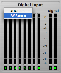 The returns are selectable in place of the ADAT inputs. In order to choose the returns rather than the ADAT inputs, click on the "ADAT" label in the digital in meter section in the Analog I/O control panel. This label is now a popup selector that allows you to choose between ADAT inputs and FW returns.