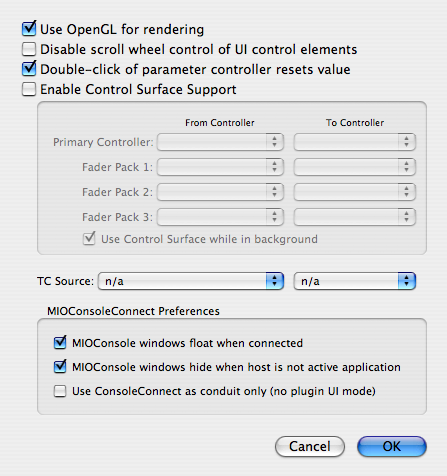 You control the mode that MIOConsoleConnect uses via the MIOConsole Preferences in the MIOConsole application.MIOConsole has new preferences for use with MIOConsoleConnect. To access these preferences, select the Preferences… command from the MIOConsoleX menu in MIOConsole. You will see: